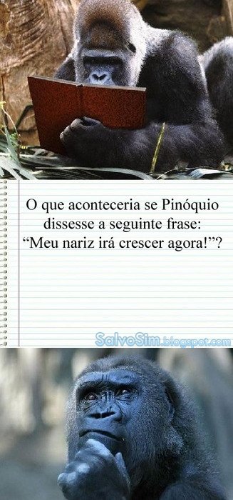Vxx manoo.... essa é zica emm! Pensa bem.... O nariz dele nao ia crescer, e se nao crescesse, seria uma mentira, e se era mentira o nariz dele deveria crescer. Mais se o nariz dele crescer entao era verdade. e se for verdade o nariz dele nao precisa crecer... Que zica manooo :S